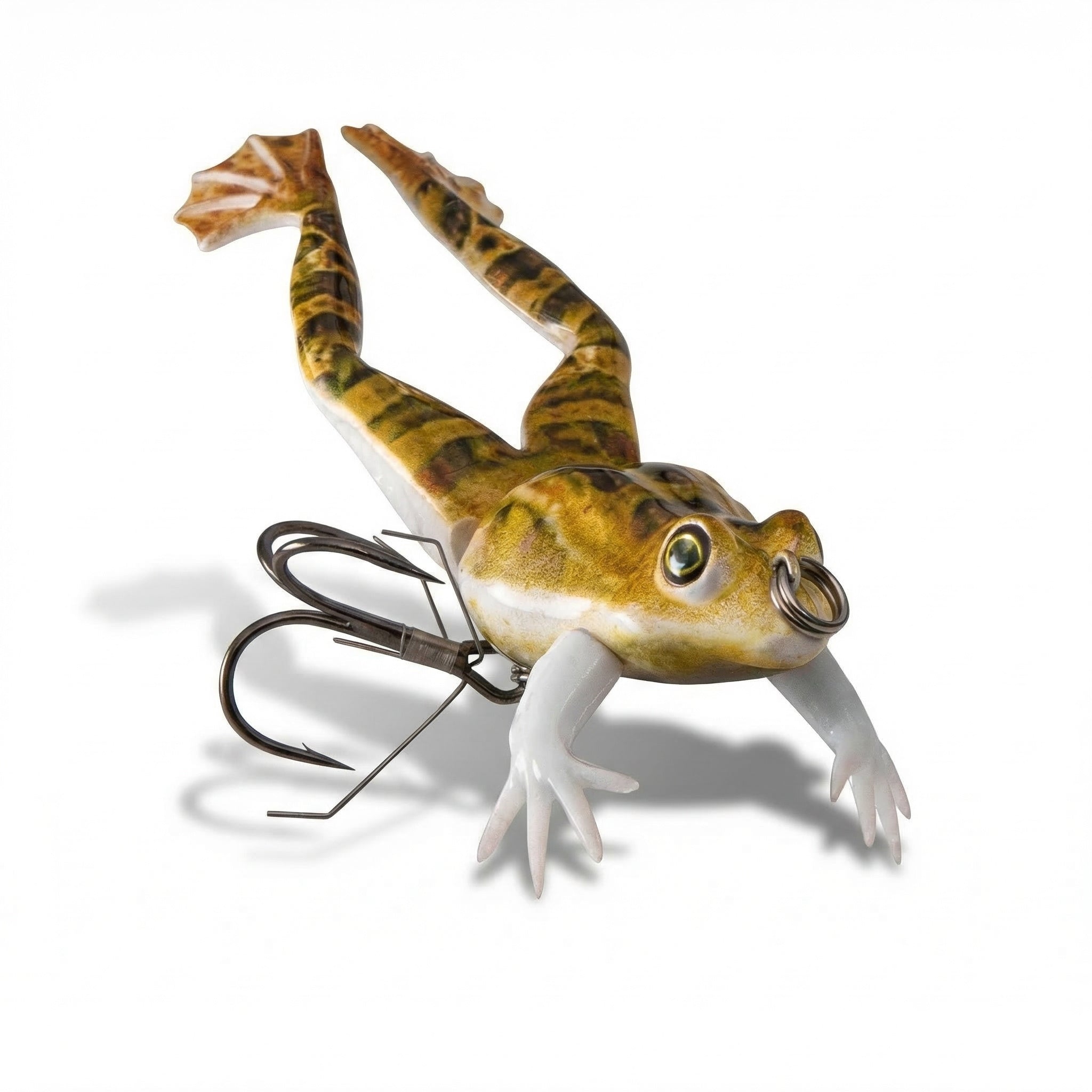 Features: Sinking, swimming, diving action; lifelike frog body shape with detailed coloring, frog markings, 3D eyes, soft fins; MNLC markings; waterproof box; Large Double hook with split rings and hook protectors; segmented jointed body.